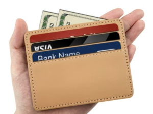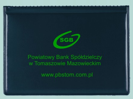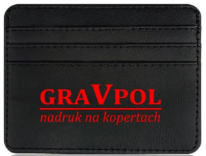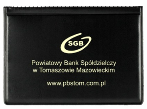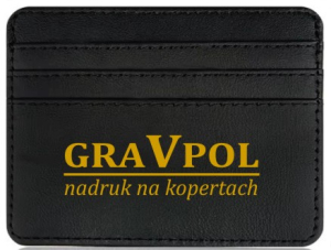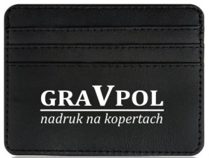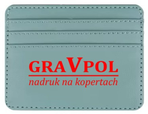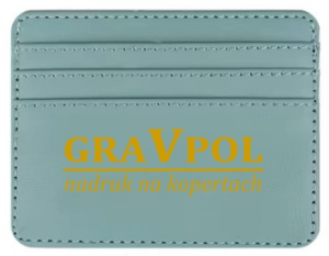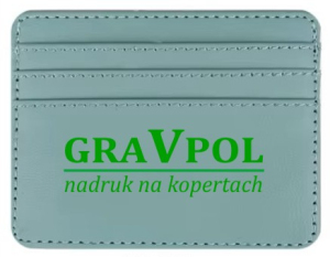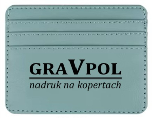 Etui na karty z ecoskóry. W kolorach khaki, czarnym, brązowym, zielonym, szarym. Nadruk w kolorach złotym, srebrnym, czarnym, zielonym, czerwonym, białym. Rozmiar etui 80 x 100 mm. Nadruk podany przykładowo.